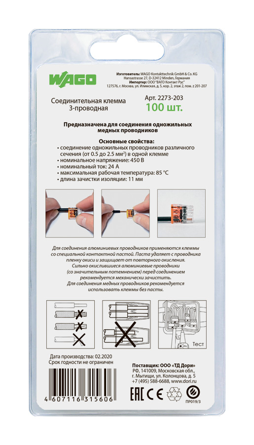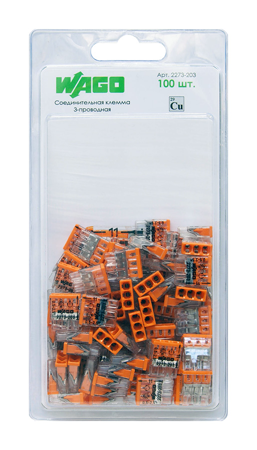 Клемма соединительная WAGO 2273-203 (3 проводника, 0.5-2.5 мм²) – 100 шт. в блистере