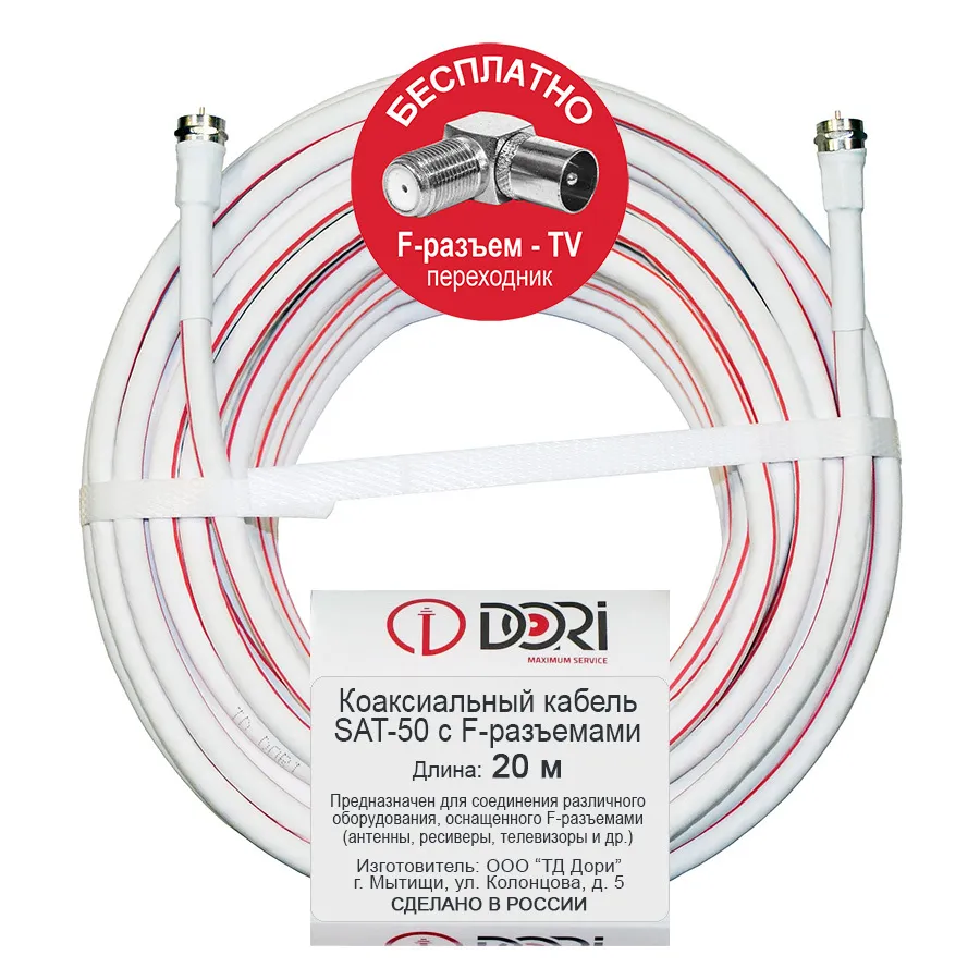 Телевизионный кабель SAT-50 длиной 20 метров обеспечивает стабильную передачу сигнала без потерь на больших расстояниях.
