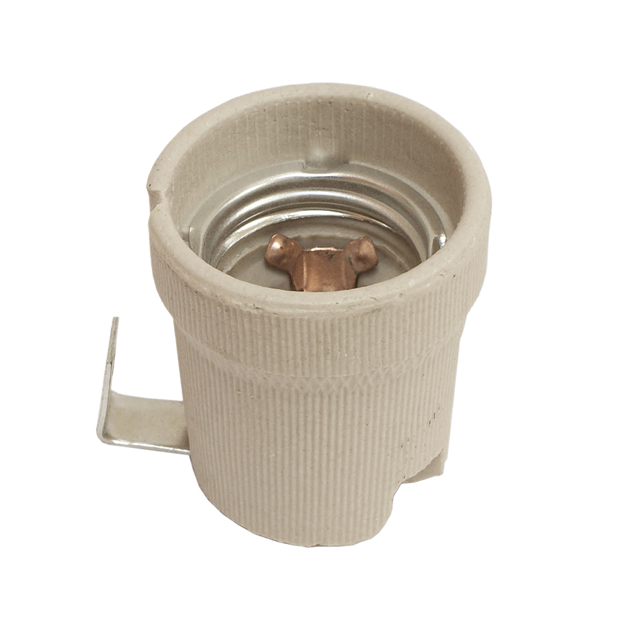 Прочный керамический патрон с цоколем Е27, оснащенный металлическим держателем для надежного крепления в светильнике. Идеальное решение для мощных ламп и высокотемпературных условий эксплуатации.