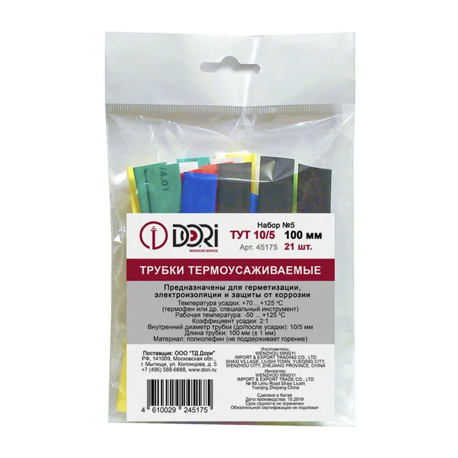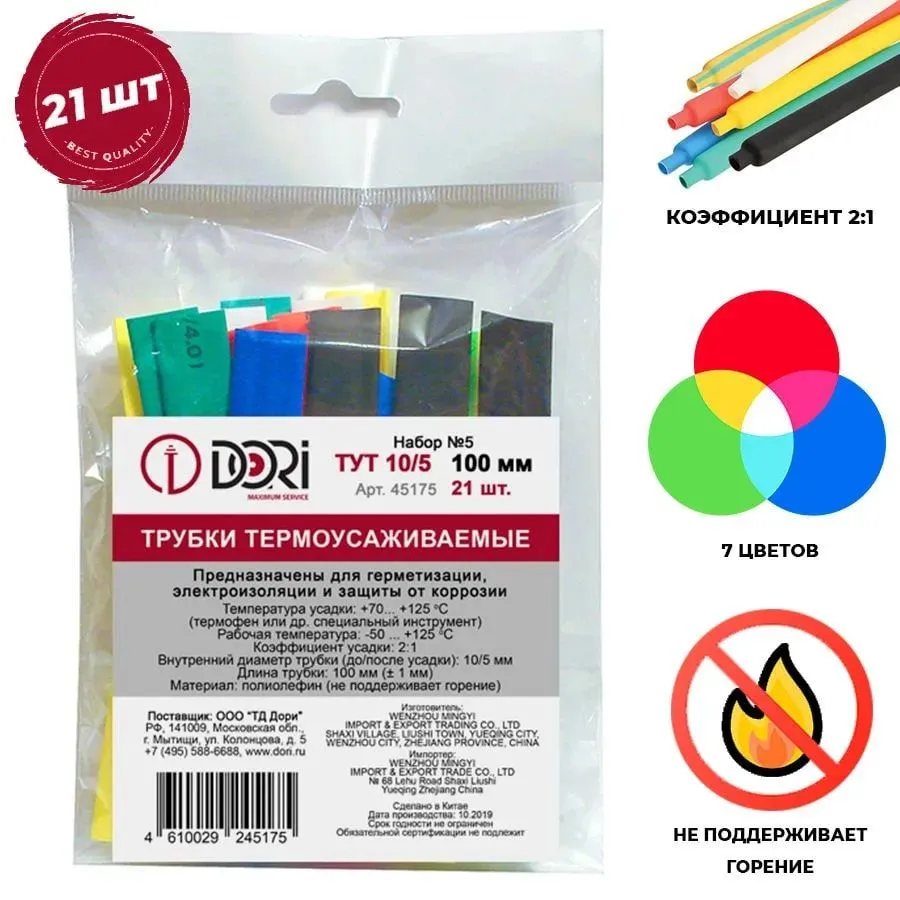 Набор термоусаживаемых трубок ТУТ 10/5 включает 21 отрезок (по 3 шт каждого из 7 цветов) длиной 100 мм. Изготовлен из полиолефина, предназначен для электроизоляции, маркировки и защиты кабельных соединений. Трубки обладают коэффициентом усадки 2:1 и полностью повторяют контуры предмета при нагреве.