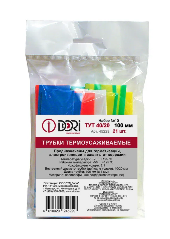Набор термоусаживаемых трубок ТУТ 40/20 включает 21 отрезок (по 3 шт каждого из 7 цветов) длиной 100 мм. Изготовлен из полиолефина, предназначен для электроизоляции, маркировки и защиты кабельных соединений. Трубки обладают коэффициентом усадки 2:1 и полностью повторяют контуры предмета при нагреве.