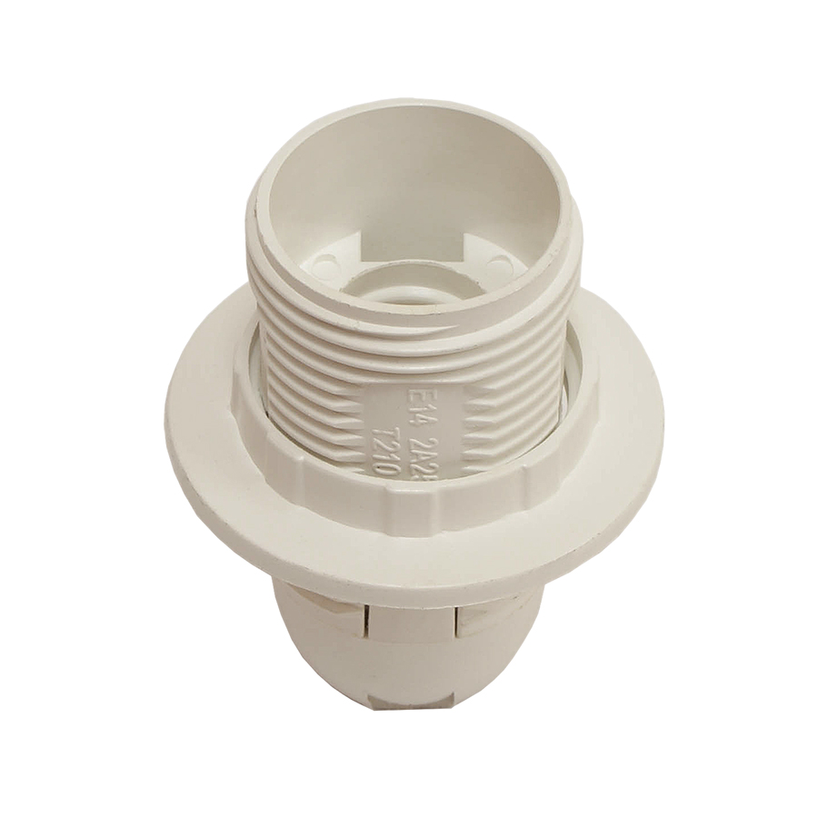 Белый пластиковый патрон с цоколем Е14, оснащенный фиксирующим кольцом. Изготовлен из термостойкого пластика, обеспечивающего безопасную эксплуатацию осветительных приборов.