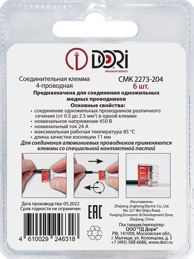 46318 Строительно-монтажная клемма Dori (СМК2273-204) 4-проводная 6 шт.
