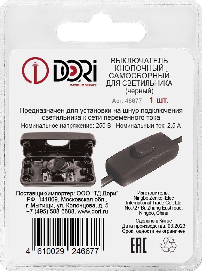 Выключатель на кабель самосборный, чёрный предназначен для удобного управления питанием электроприборов через кабель. Устанавливается непосредственно на провод, обеспечивая быстрый и безопасный монтаж без дополнительных инструментов.