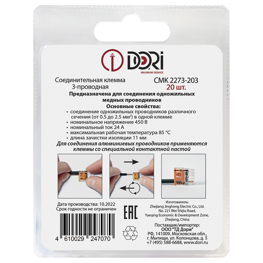 Строительно-монтажная клемма Dori (СМК2273-203) 3-проводная, 20 шт.