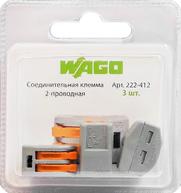 Мини-набор клемм WAGO 222-412 (2 проводника, 0.08-4.0 мм²) – 3 шт. в блистере