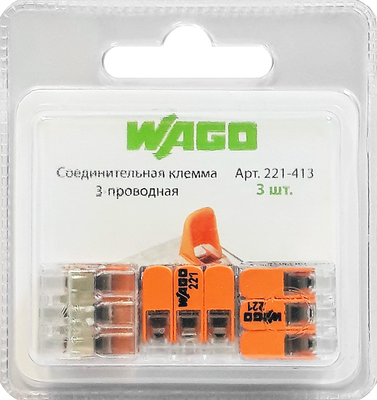 Клеммник соединительный WAGO 221-413 (3 проводника, 0.14-4 мм², прозрачный) – 3 шт. в блистере