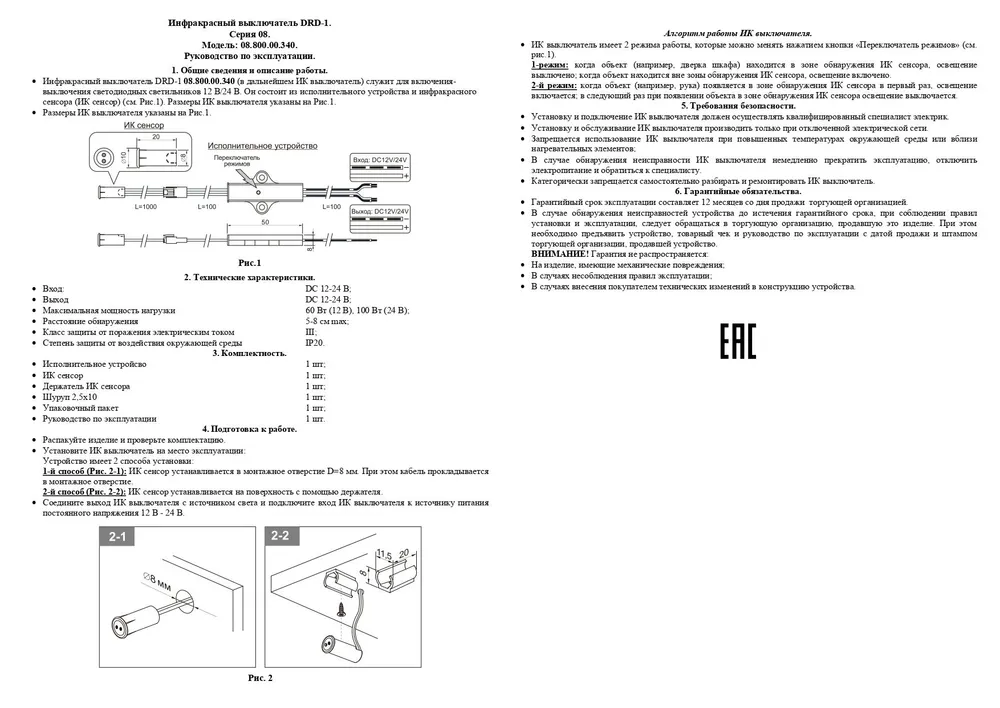 49661 DRD-1 ИК Выключатель на касание с одним сенсором, на взмах руки и открывание двери