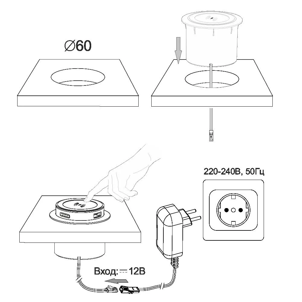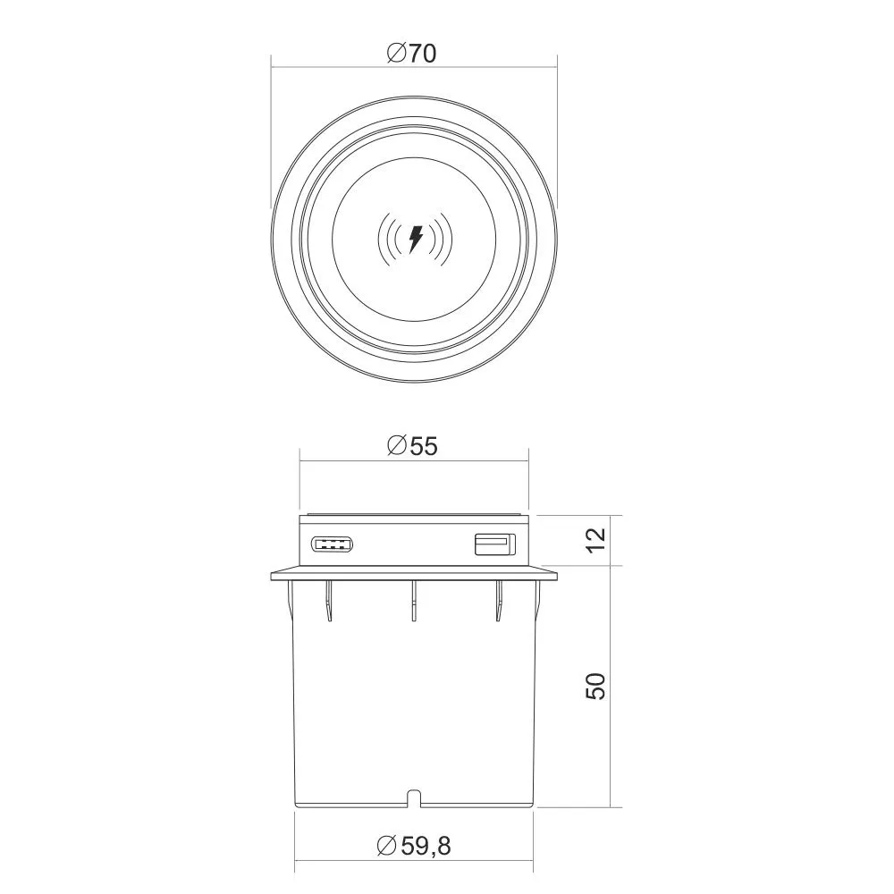 49685 LIFT mini Источник питания POP UP зарядное устройство встраиваемое, D70*50, белое, вход: 12В, 3А, беспроводное зарядное устройство 10Вт, USB-A+USB-C 18Вт, провод 1м адаптер 220В 36Вт