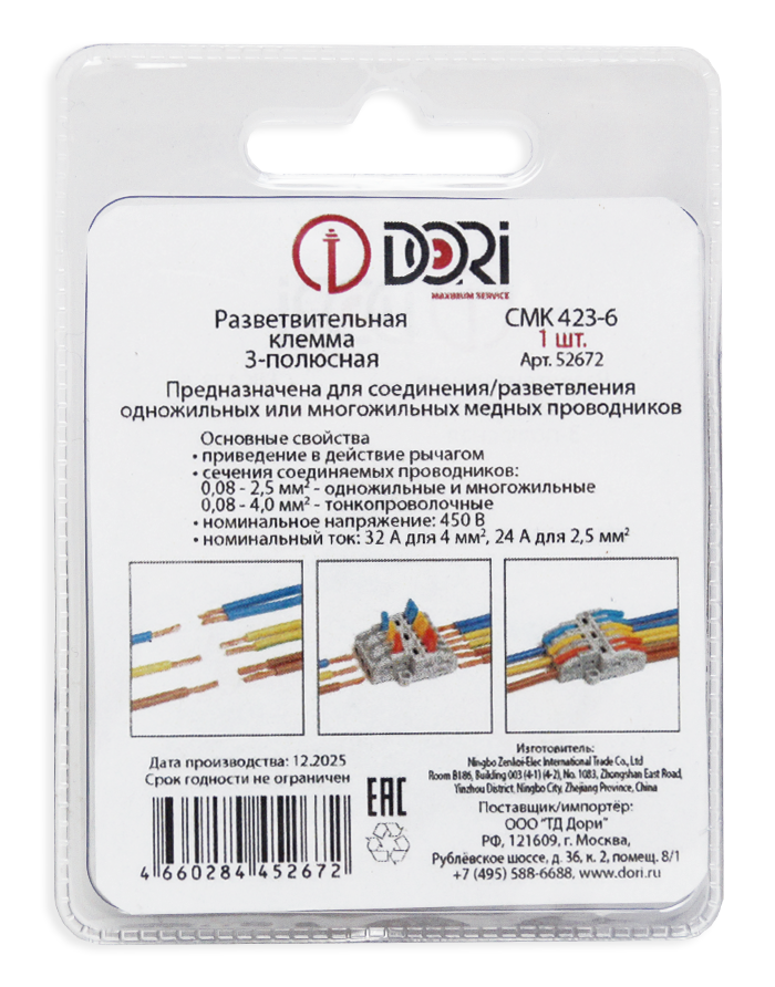 Разветвительная клемма Dori (СМК 423-6) трехполюсная, 1шт. в блистере