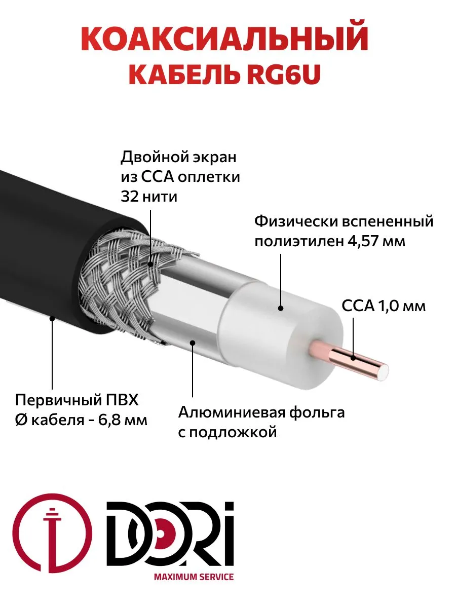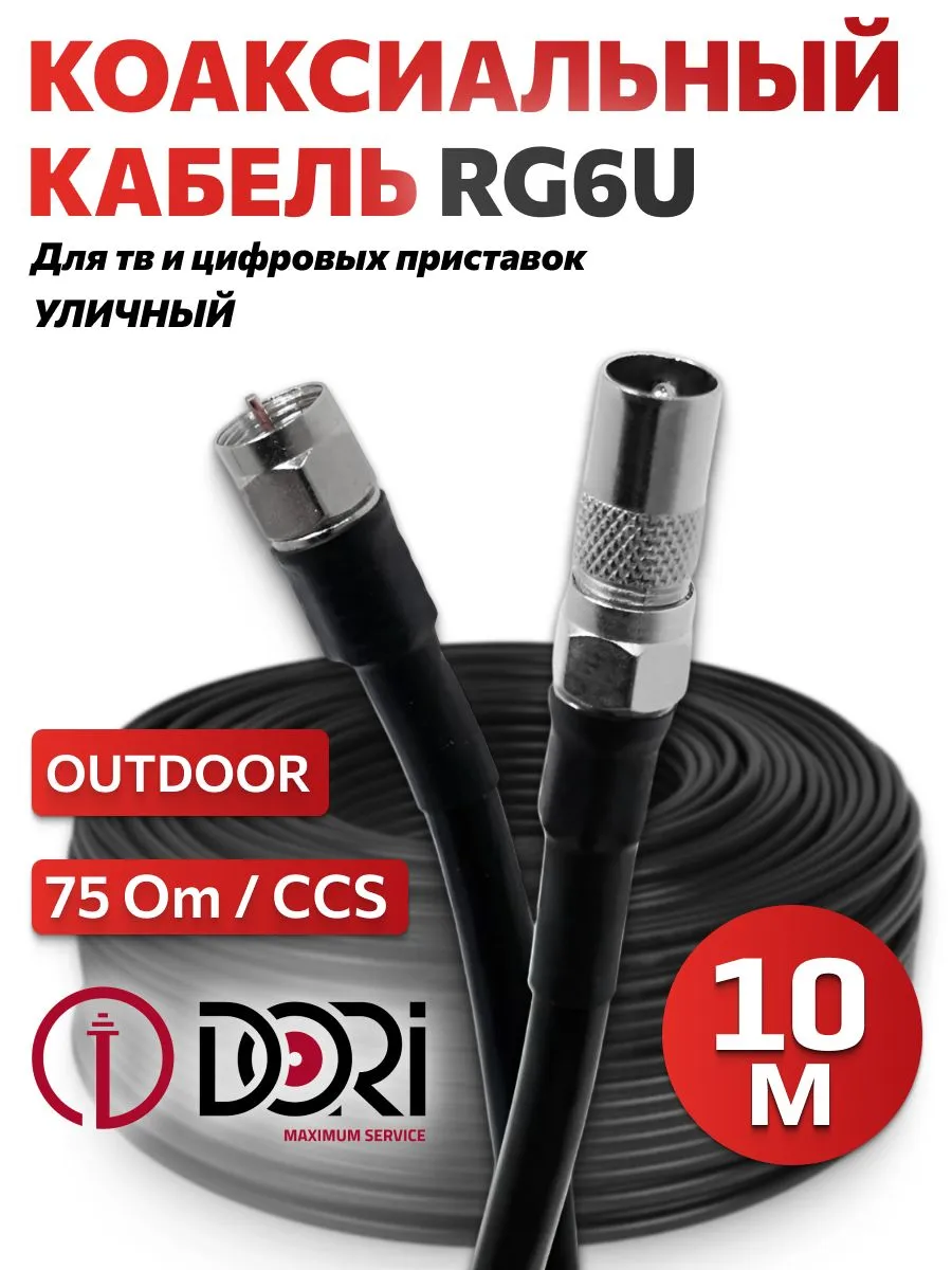 52870 Коаксиальный телевизионный кабель DORI RG-6 черный 10м (F-разъемы+TV-переходник), 1шт