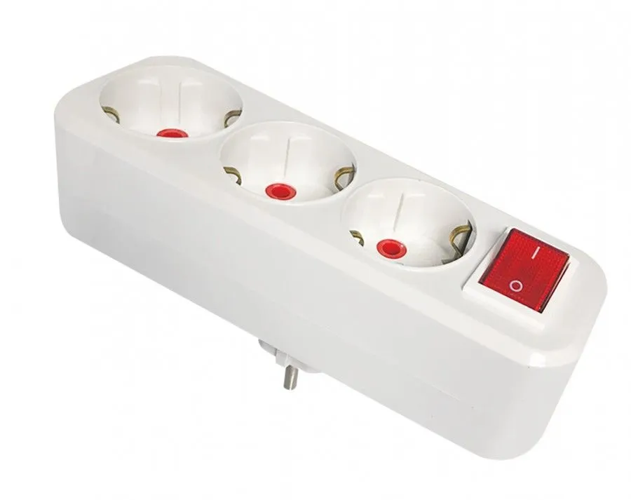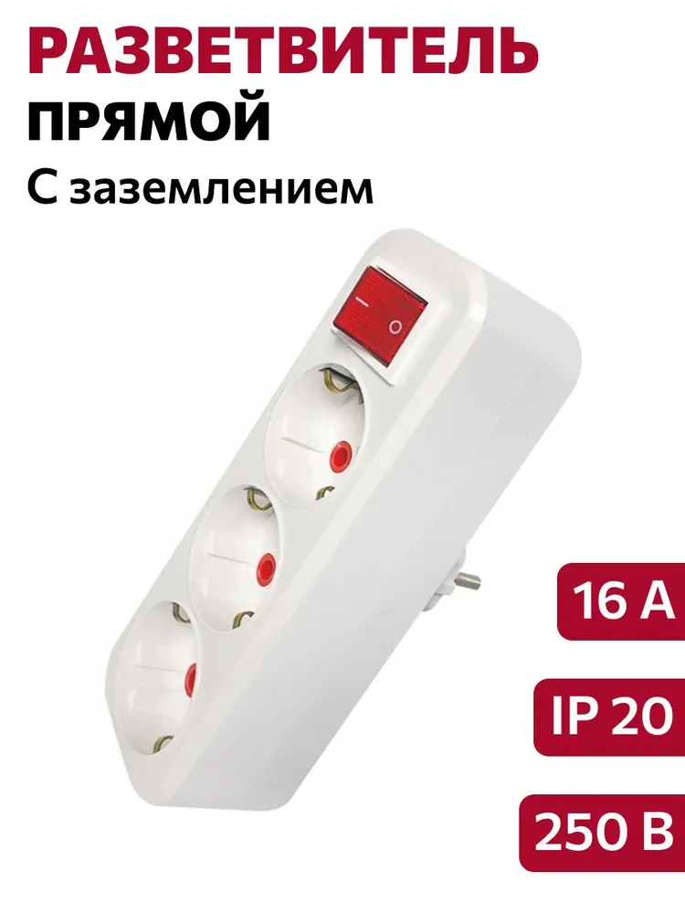 - Разветвитель с заземлением на 3 розетки прямой, белый, 16А/250В с выключателем — 1 шт.